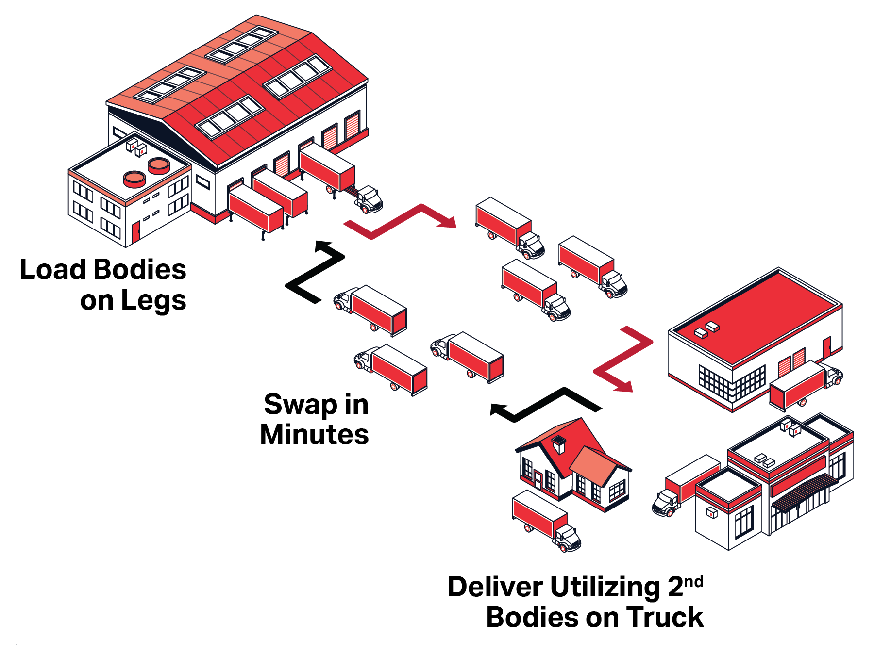 Instead of a truck waiting to be loaded, the body can be loaded independently while the truck is already out making deliveries. When the truck returns, it simply swaps bodies and gets back on the road in minutes.